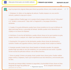 Una pregunta que se estarán haciendo en este momento es ¿Qué tiene que ver la inteligencia artificial con la industria webcam? Bueno, en realidad mucho, porque una herramienta de inteligencia artificial la podemos usar para obtener ideas en nuestro campo, es decir, podemos preguntar al bot sobre ideas, guiones para un video que queremos realizar, tipo de ropa que me podría quedar si soy delgada o si tengo algunos kilos de más, tipo de maquillaje a usar según mi tipo de rostro o incluso preguntar por ángulos. Lógicamente, esto no es la panacea ni tiene la “fórmula mágica” del éxito, pero indudablemente la herramienta bien usada podría darnos algunas luces o consejos diferentes sobre lo que hemos estado haciendo.