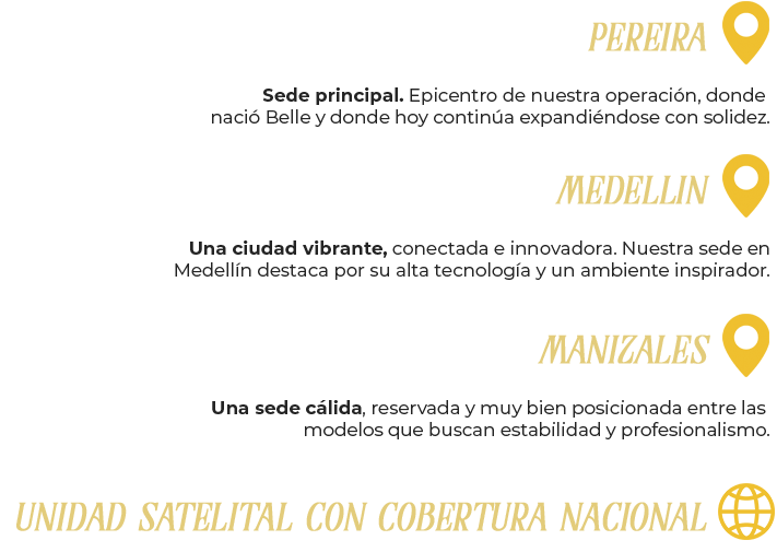No importa en qué ciudad te encuentres. Gracias a nuestra unidad satelital puedes ser parte de Belle desde cualquier lugar de Colombia, con acceso remoto a nuestros entrenamientos, asesorías y acompañamiento completo.